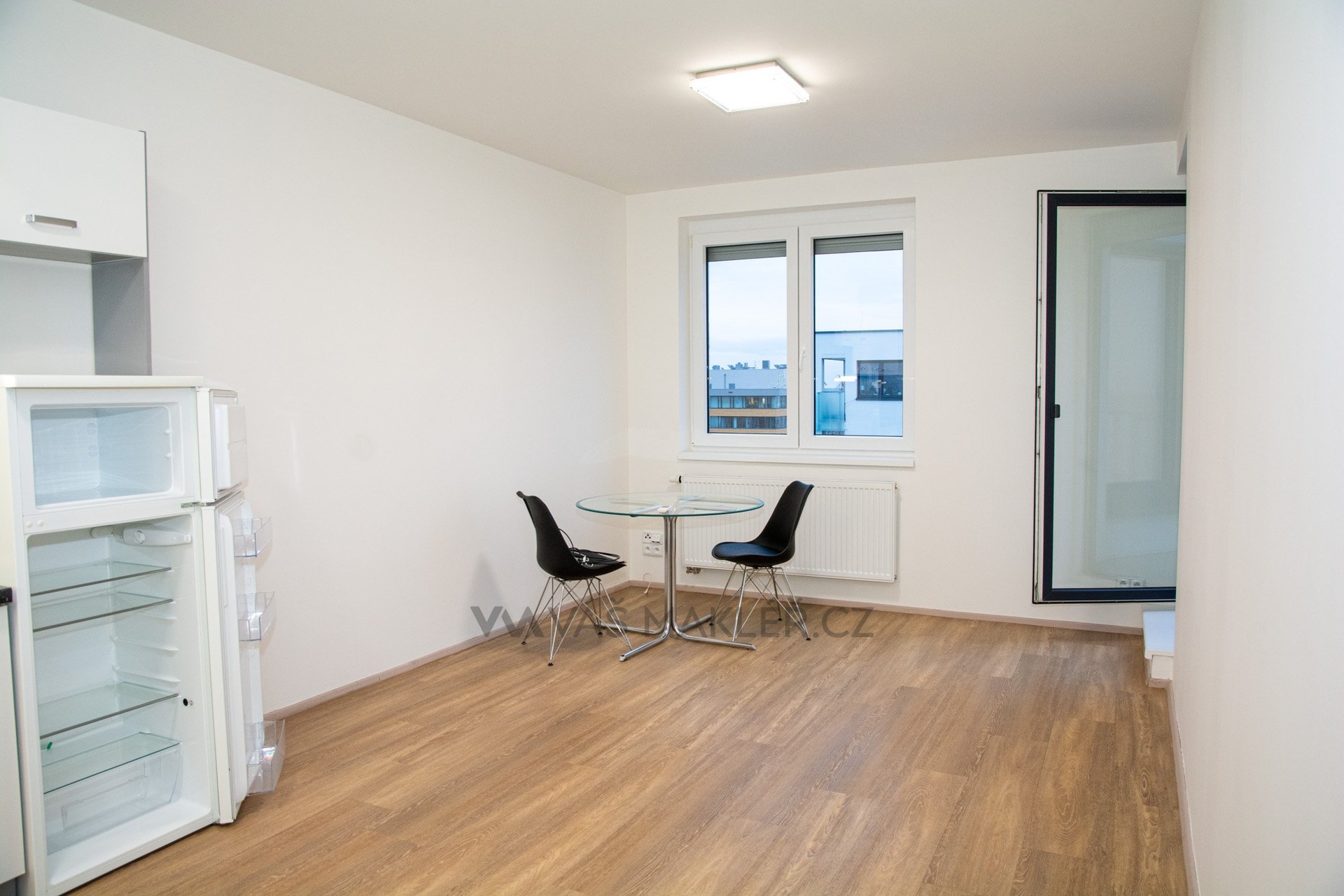 Dispozičně je byt řešen velmi prakticky. Prostorná vstupní chodba (4,3 m2) slouží jako centrální vstup do všech místností. Po pravé straně se nachází komora/šatna (2,8 m2) s instalovanými úložnými regály. Ložnice (cca 10 m2) má okno směřující na balkon. Obývací pokoj s kuchyňským koutem (cca 20 m2) je prosvětlený a umožňuje vstup na balkon (3,1 m2), který je zapuštěn a tak nabízí větší míru soukromí. Díky umístění v nejvyšším patře je navíc balkon příjemně osluněný.