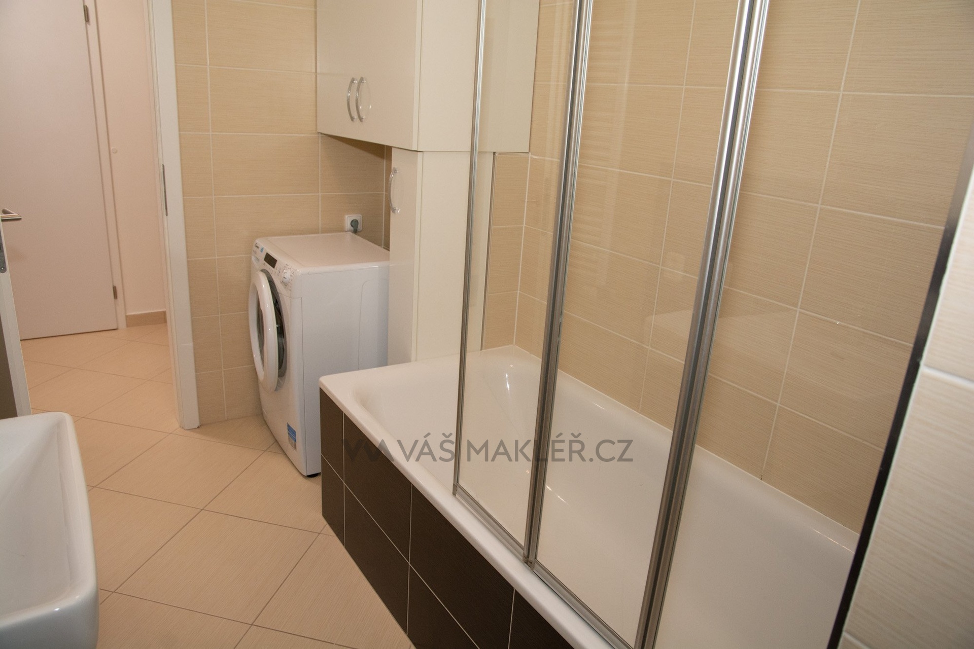 Koupelna (6,5 m2) je vybavena vanou se zástěnou, umyvadlem, toaletou, zrcadlem a pračkou. Komfort bydlení zvyšují dálkově ovládané venkovní rolety.